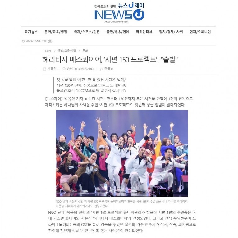 [기사] 헤리티지 매스콰이어, ‘시편 150 프로젝트’... 출발(뉴스제이)