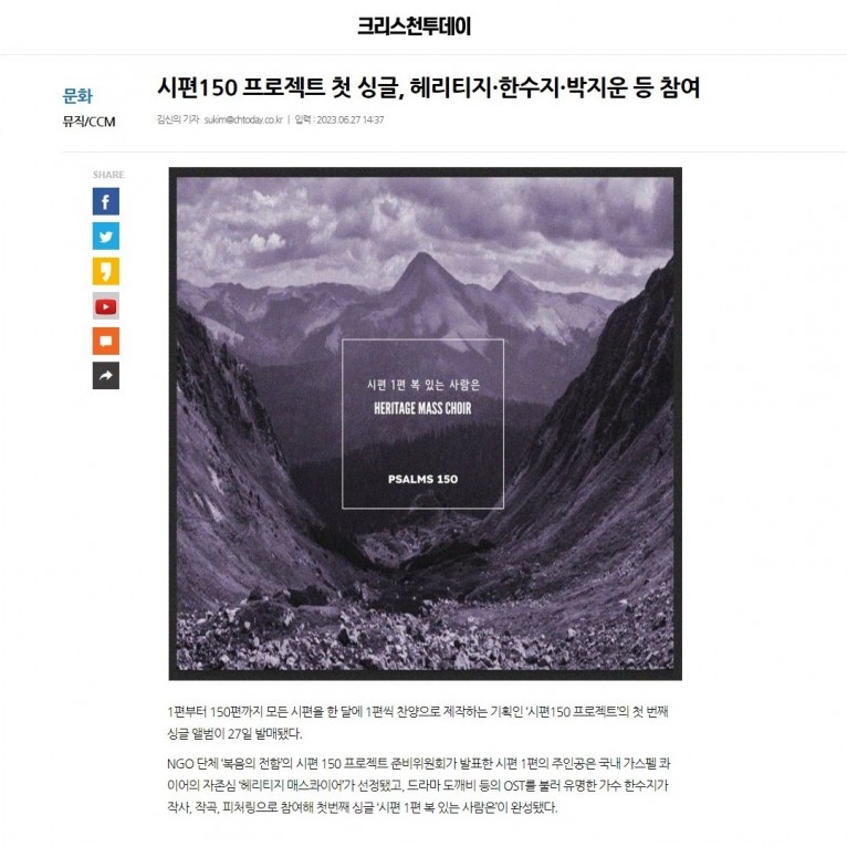 뮤직타임 [기사] 시편150 프로젝트 첫 싱글, 헤리티지·한수지·박지운 등 참여(크리스천투데이)