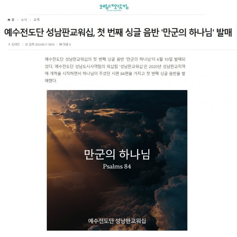 [기사] 예수전도단 성남판교워십, 첫 번째 싱글 음반 '만군의 하나님' 발매(코람데오닷컴)