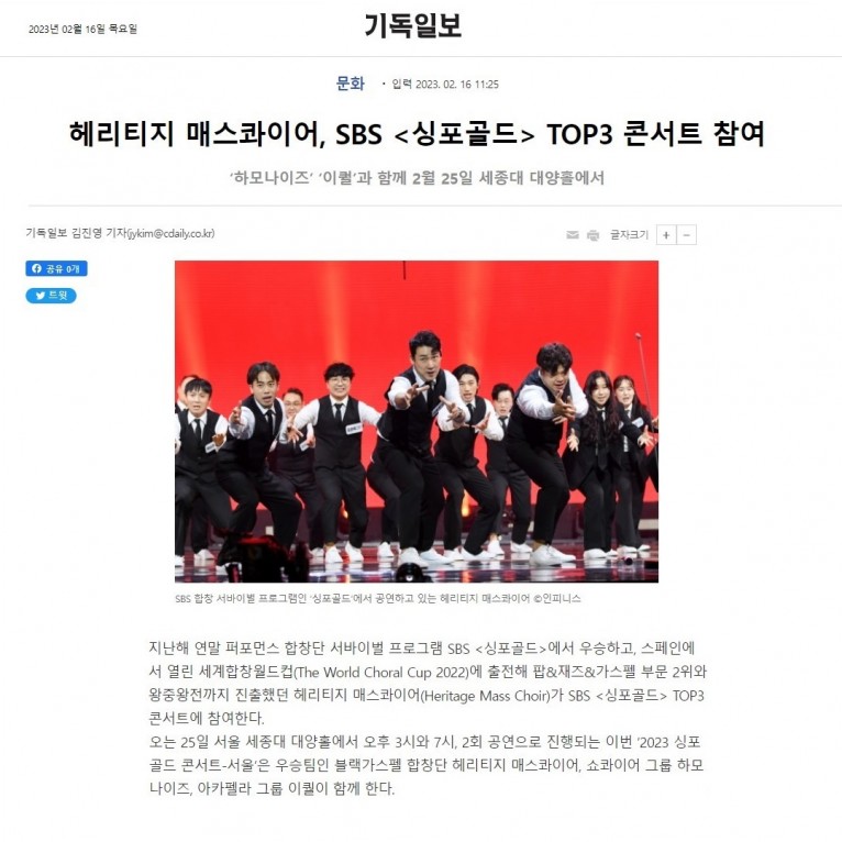 [기사] 헤리티지 매스콰이어, SBS 싱포골드 TOP3 콘서트 참여