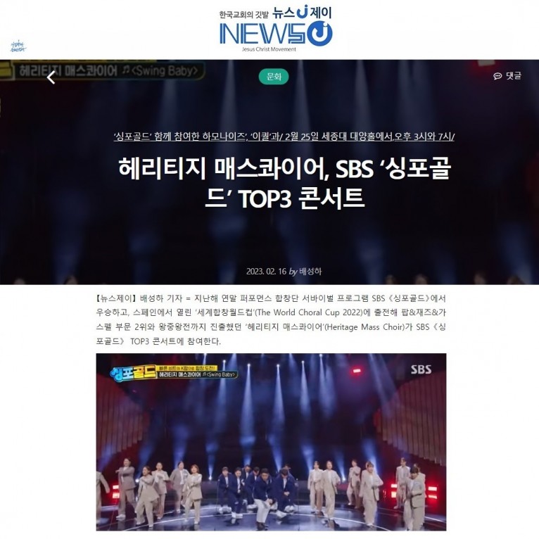 [기사] 헤리티지 매스콰이어, SBS ‘싱포골드’ TOP3 콘서트