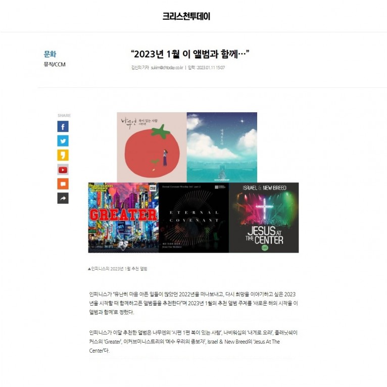 인피니스가 이달 추천한 앨범은 나무엔의 ‘시편 1편 복이 있는 사람’, 나비워십의 ‘내게로 오라’, 플래닛쉐이커스의 ‘Greater’, 이커브미니스트리의 ‘예수 우리의 중보자’, Israel & New Breed의 ‘Jesus At The Center’다.