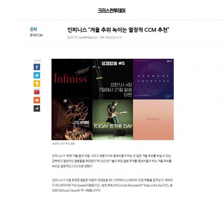 [기사] 인피니스 “겨울 추위 녹이는 열정적 CCM 추천”(크리스천투데이)