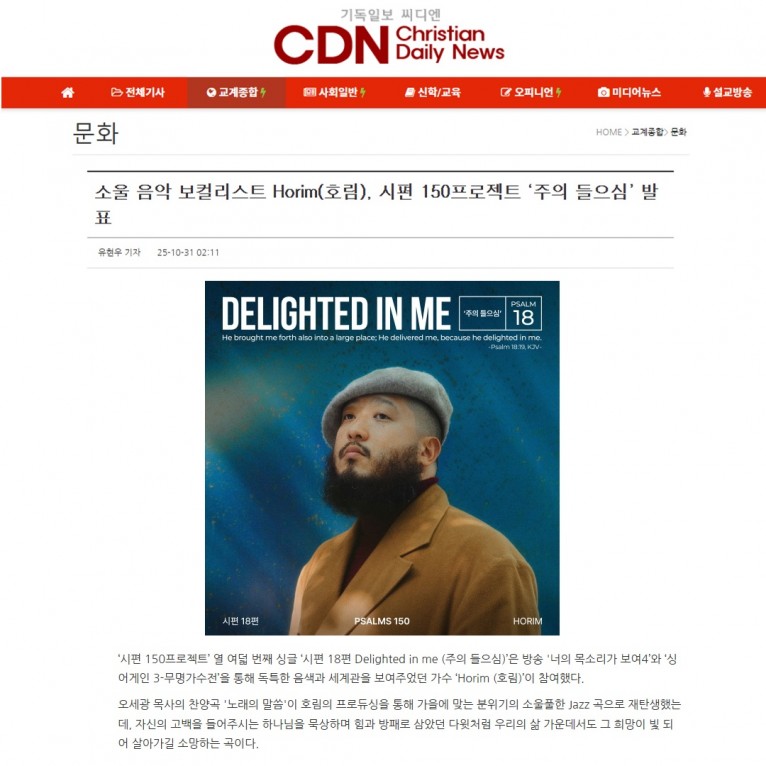 뮤직타임 [기사] 소울 음악 보컬리스트 Horim(호림), 시편 150프로젝트 ‘주의 들으심’ 발표(기독일보 씨디엔)