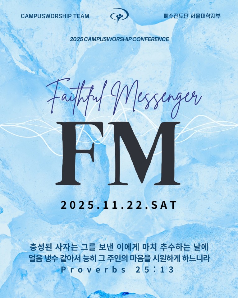 11월 22일 토요일 오후 4시부터 명동에 있는 충무교회에서 진행되는 이번 컨퍼런스는 “FM: Faithful Messenger, 주님의 마음을 시원케 하는 충성된 사자!” 라는 주제를 가지고 이 시대를 살아가는 청년, 대학생, 다음 세대가 함께 모여 하나님을 예배하고 하나님께서 주시는 말씀 가운데 순종하며 반응하는 예배 컨퍼런스를 목표로 준비하고 있다.