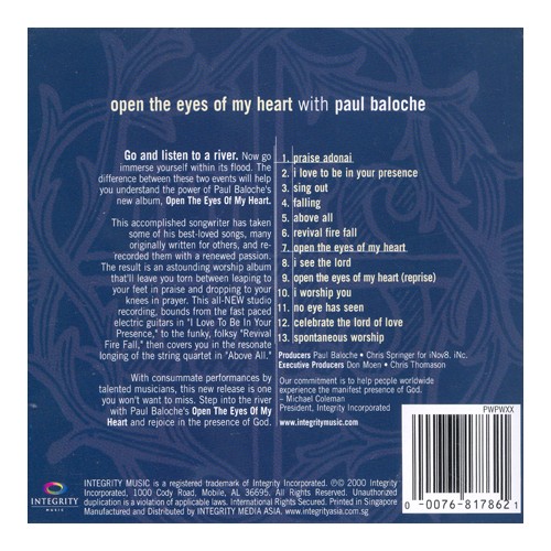 세계적인 워십 리더 폴 발로쉬의 베스트음반 이자 첫 번째 프로젝트 앨범인 Open the eyes of my heart는 그의 지난 10년간의 사역을 정리하는 앨범으로 자신이 작곡해 다른 워십 리더들이 불러 유명해진 라이브 워십들을 새롭게 해석해 이번에는 스튜디오 버전으로 자신이 직접 부르고 있다.